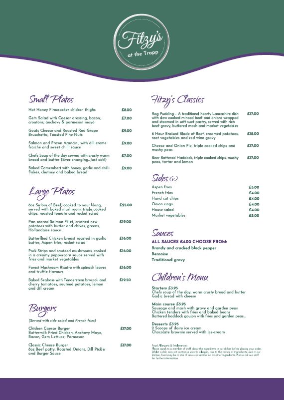 - Dinner, In our Fitzy's Restaurant. This is a £25pp Allowance on our full menu. Dinner is served between 18.00-20.30 and this is also via reservation